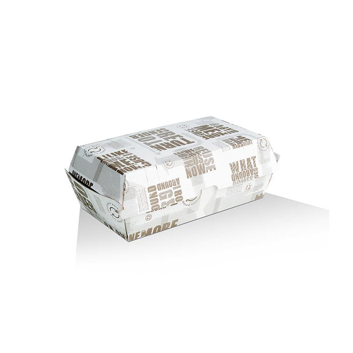 Printed corrugated snack box, ideal for takeaway and food-to-go. Sturdy, practical and perfect for hot snacks and fast food.